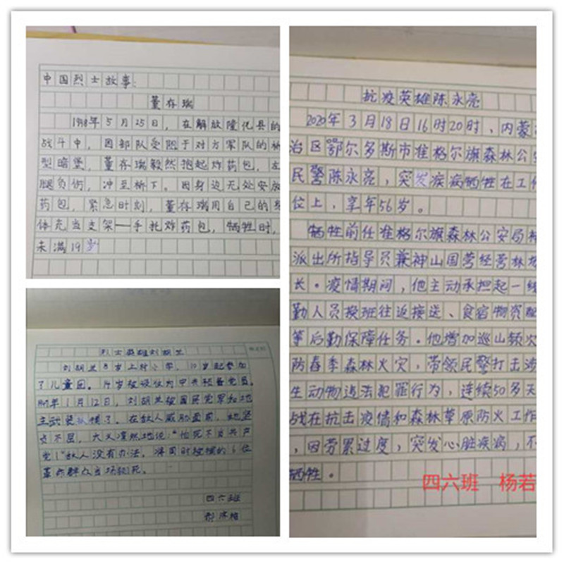 一个有希望的民族不能没有英雄,一个有前途的国家不能没有先锋!历史的接续和传承,就是一代代使命和责任的接力,无论是浴血奋战的革命前辈还是逆行而上的抗疫先锋,他们爱国奉献的共同底色从未改变。第三小学的队员们用文字、书法、绘画等形式述说着自己心中的英雄。