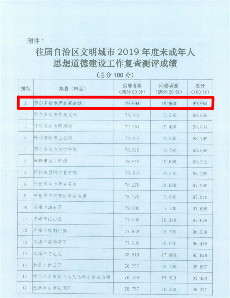日前,2019年内蒙古自治区文明城市2019年度未成年人思想道德建设工作复查测评成绩公布,我旗在往届自治区文明城市未成年人思想道德建设工作中获得全区第一的好成绩。