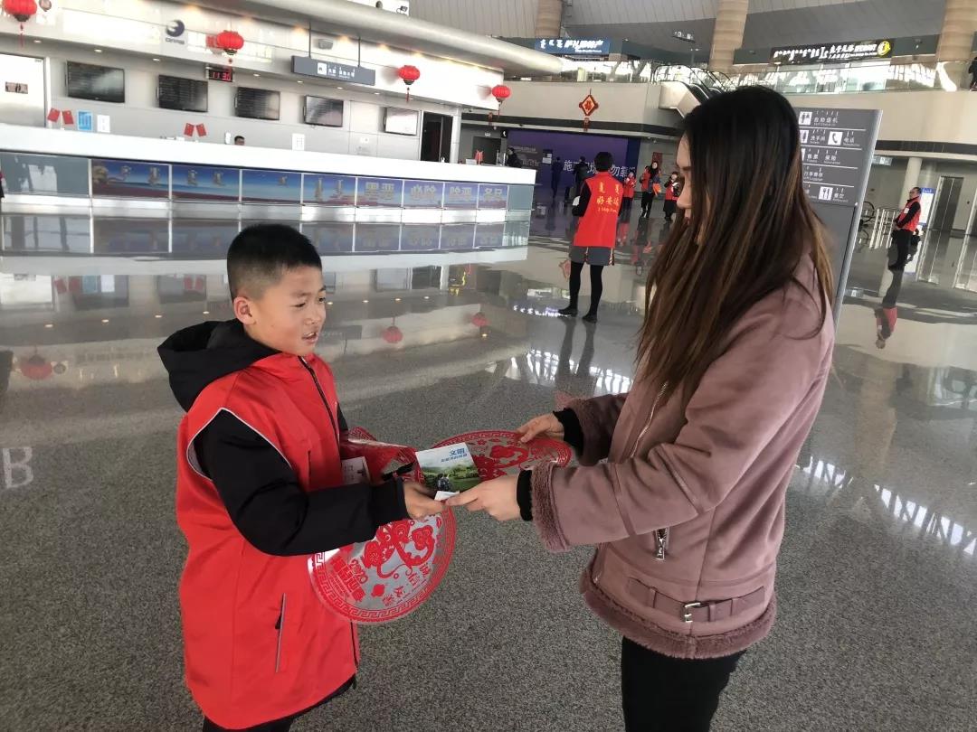 图为小志愿者发放文明旅游宣传单