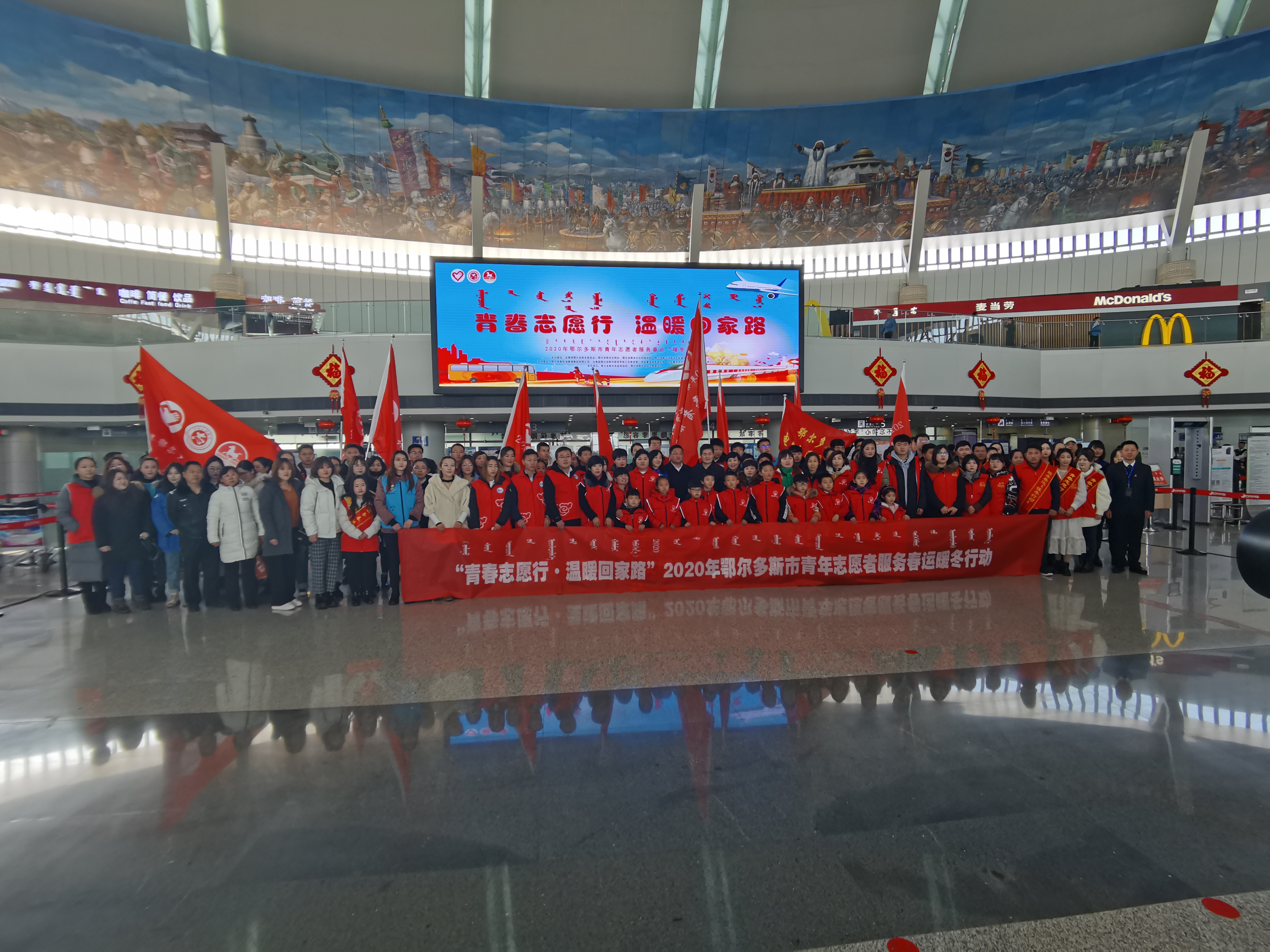 1月10日,由共青团鄂尔多斯市委员会、鄂尔多斯市文明办、鄂尔多斯市文化和旅游局、鄂尔多斯市国有资产监督管理委员会主办的“青春志愿行·温暖回家路”2020年鄂尔多斯市青年志愿者服务春运“暖冬行动”启动仪式在鄂尔多斯机场举办,200余名青年志愿者代表齐聚活动主会场,接过“暖冬行动”活动旗帜,代表着全市各级团组织、各级志愿者组织奔赴机场、火车站、汽车站等春运最前线,用优质的服务和无私的奉献来展现青春风采,用微笑去温暖每一个回乡的旅客。至此,为期40天的春运“暖冬行动”主题活动正式启动。