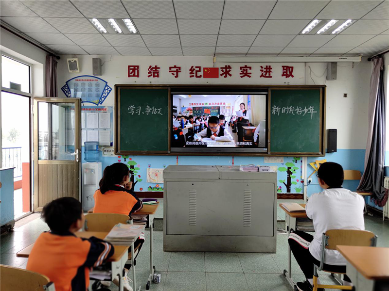 图为学校组织学生观看新时代好少年和美德少年视频和事迹材料