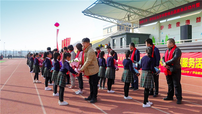 清明节期间,伊金霍洛旗委宣传部、文明办、教育局等部门联合开展了‘伊金霍洛旗爱洒三月•好安达全民学雷锋志愿服务活动月暨“扣好人生第一粒扣子”主题活动’。活动在庄严的升国旗仪式中拉开序幕,旗委宣传部副部长徐建霞作了发言,第五小学200名学生共同诵读了《给雷锋叔叔的诗》。活动中,旗文明办、旗总工会、团旗委、伊旗社会组织发展中心、伊旗女企业家协会为中小学校共发放爱心物资9.6万元。孩子们向鄂尔多斯市草原情“助学·筑梦·铸人”志愿服务项目“一对一”助学活动献爱心的63名“最美雷锋”献花致敬。活动最后,到场的领导、各行各业志愿者代表和学生代表进行了签名和微心愿认领活动。