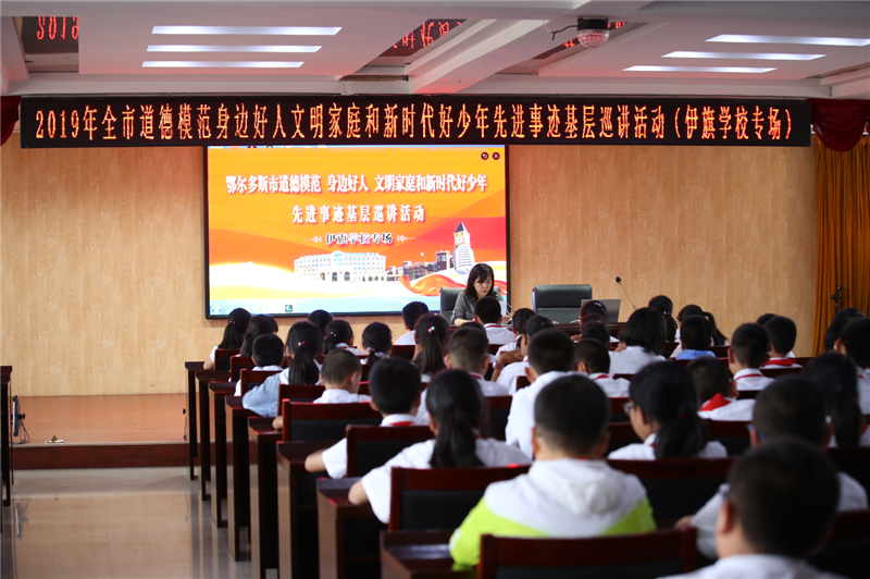 以“六一”为契机,伊金霍洛旗开展了未成年人先进典型选树和学习宣传活动,在未成年人群体中掀起践行传统美德、争做美德少年和新时代好少年的热潮。举办了“美德少年、新时代好少年”先进事迹宣讲活动。6月24日至26日,伊金霍洛旗举办了2019年鄂尔多斯市道德模范、身边好人、文明家庭和新时代好少年先进事迹基层巡讲活动。各学校借助学校网站、qq群、微信开展网上“观摩和学习未成年人先进典型”先进事迹活动,利用班队会学习鄂尔多斯市新时代好少年和伊金霍洛旗美德少年事迹,讲述身边美德故事。同时学生们纷纷登陆鄂尔多斯文明网和伊金霍洛文明网“学习和争做未成年人典型”专栏,写下自己争做美德少年和新时代好少年的决心。