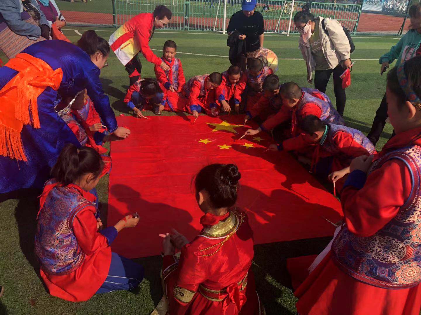 图为伊金霍洛旗蒙古族小学绘国旗现场