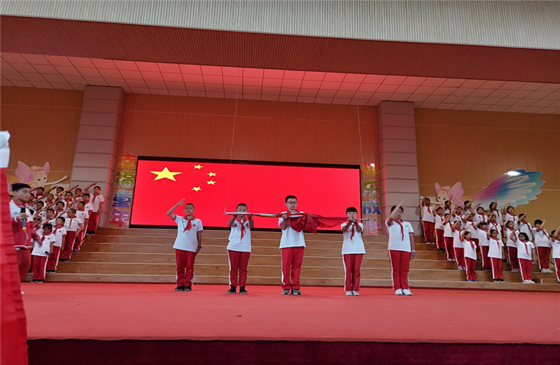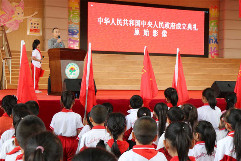 清晨,全校师生聚集在礼堂,举行了“为祖国70华诞献礼 做新时代的追梦人”主题升旗仪式。升旗手们精神抖擞、昂首挺胸的护卫着国旗,迈着铿锵有力的步伐,走向升旗台。在全体师生雄壮的国歌声中,将鲜艳的五星红旗冉冉升起。紧接着在折冉宁同学的带领下,全体学生唱响学校的校歌《欢乐童年》,为祖国献上了一份特殊的礼物,让歌声表达出孩子们内心的祝福,祝愿祖国繁荣昌盛。随后,通过观看微视频《开国大典》,让孩子们再一次见证了祖国70年的风雨历程。最后,一曲《我的中国心》更是表达出了二小全体师生质朴的心声,二小的孩子们也随着这激昂的音乐,踏着整齐的步伐,共同迎接祖国美好的明天。